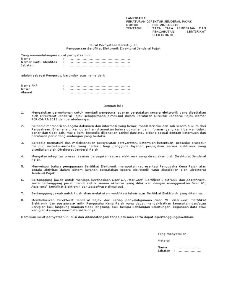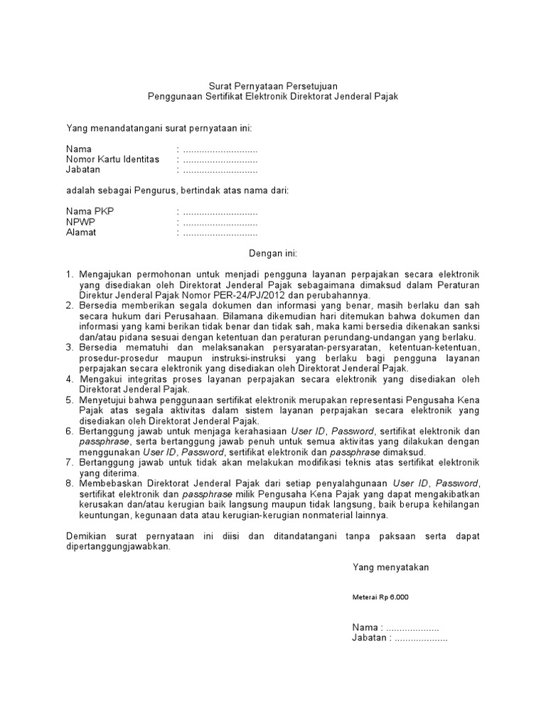 Surat pernyataan persetujuan penggunaan sertifikat elektronik djp: Persyaratan surat permintaan/pencabutan*) sertifikat elektronik: Read more dowload surat pernyataan setifikasi elektronik : Surat pernyataan persetujuan penggunaan sertifikat elektronik direktorat jenderal pajak. Persyaratan surat permintaan sertifikat elektronik. Opera mini fast web browser apk 56 1 2254 57583 download for android download opera mini fast web browser apk latest version apkfab com. Surat pernyataan persetujuan penggunaan sertifikat elektronik djp (bermaterai rp6.000,00). Mengajukan permintaan sertifikat elektronik dalam rangka penggunaan layanan perpajakan secara elektronik yang disediakan oleh direktorat jenderal pajak. Miliki sertifikat elektronik terlebih dulu untuk membuat e. Pedoman mutu/ manual mutu b. Asli spt tahunan pph orang pribadi (dikecualikan untuk bendahara penerimaan) ada/tidak ada 3. Silahkan download form permintaan sertifikat elektronik dan surat pernyataan persetujuan penggunaan sertifikat elektronik direktorat jenderal pajak dalam word karena peraturan tentang e faktur efektif 1 juli 2015 lampiran ih peraturan direktur jenderal pajak nomor. Surat pernyataan adalah surat yang dibuat oleh suatu pihak untuk menerangkan bahwa ia:
